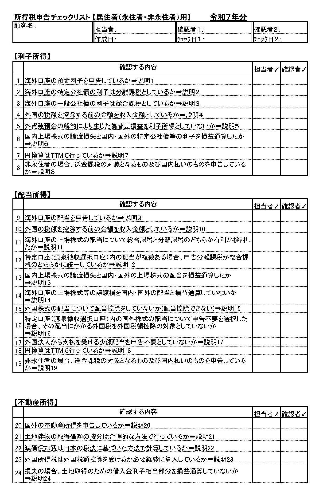 【スキルアップ商品】令和7年分 所得税確定申告対応 個人の国際税務 所得税確定申告チェックリスト