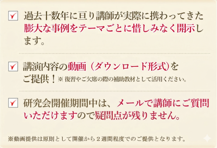 1. 過去十数年に亘り講師が実際に携わってきた膨大な事例をテーマごとに惜しみなく開示します。