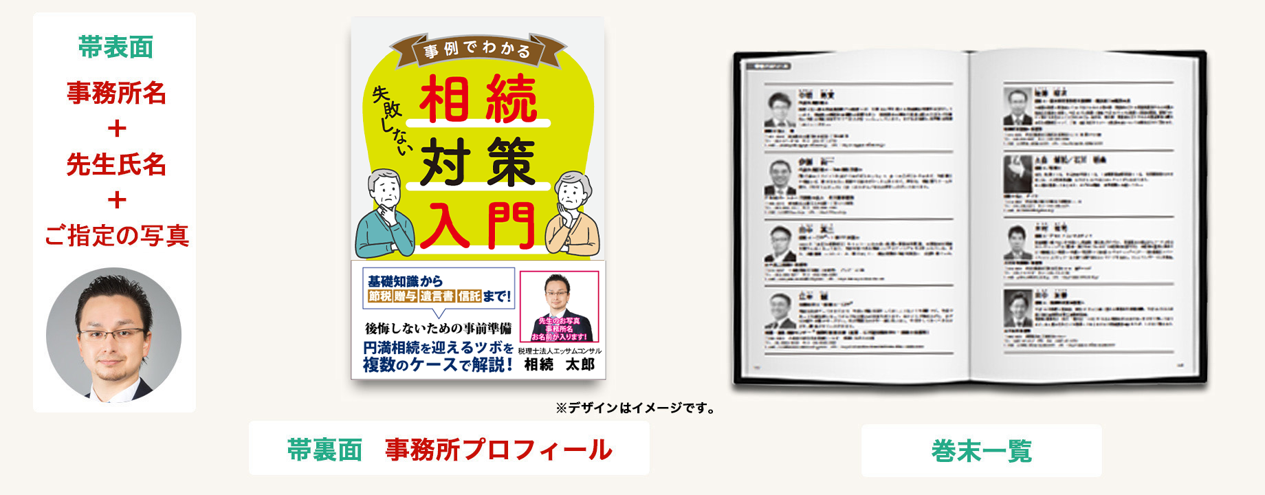 本書籍には先生の「ご指定の写真入りオリジナル帯」が巻かれ、書籍巻末には「事務所のプロフィール」を掲載します。